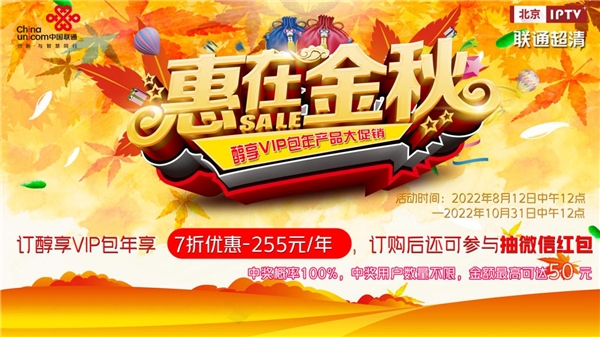 夏日已过,秋季接档,北京联通IPTV醇享VIP7折活动又来啦!秋天的第一杯奶茶,搭配IPTV醇享VIP,享受味蕾和精神的双重满足,快来体验吧!